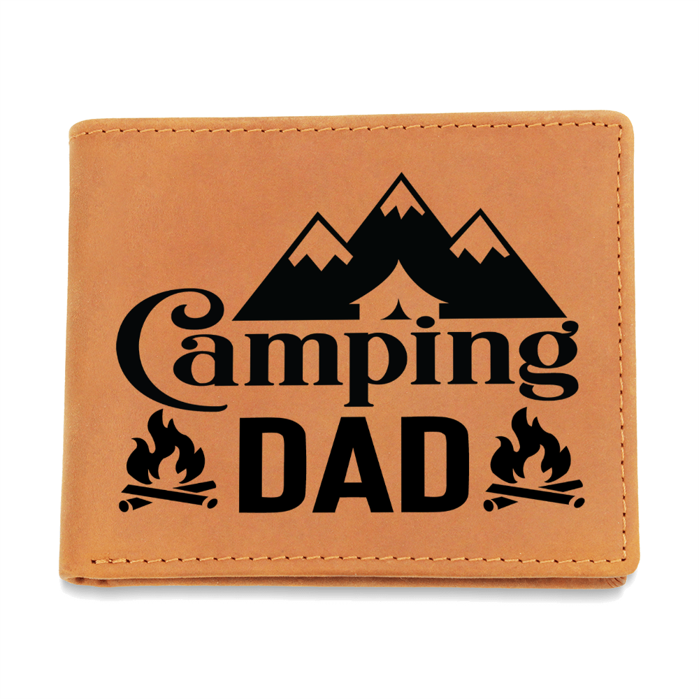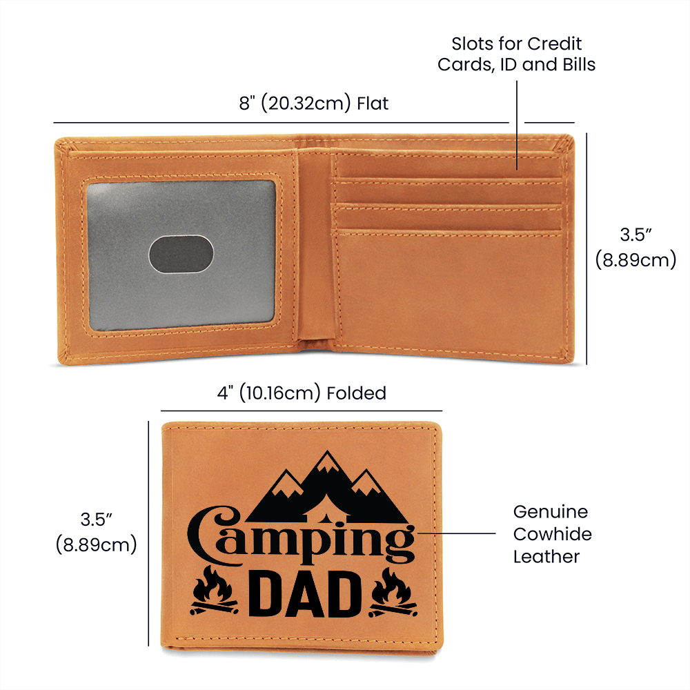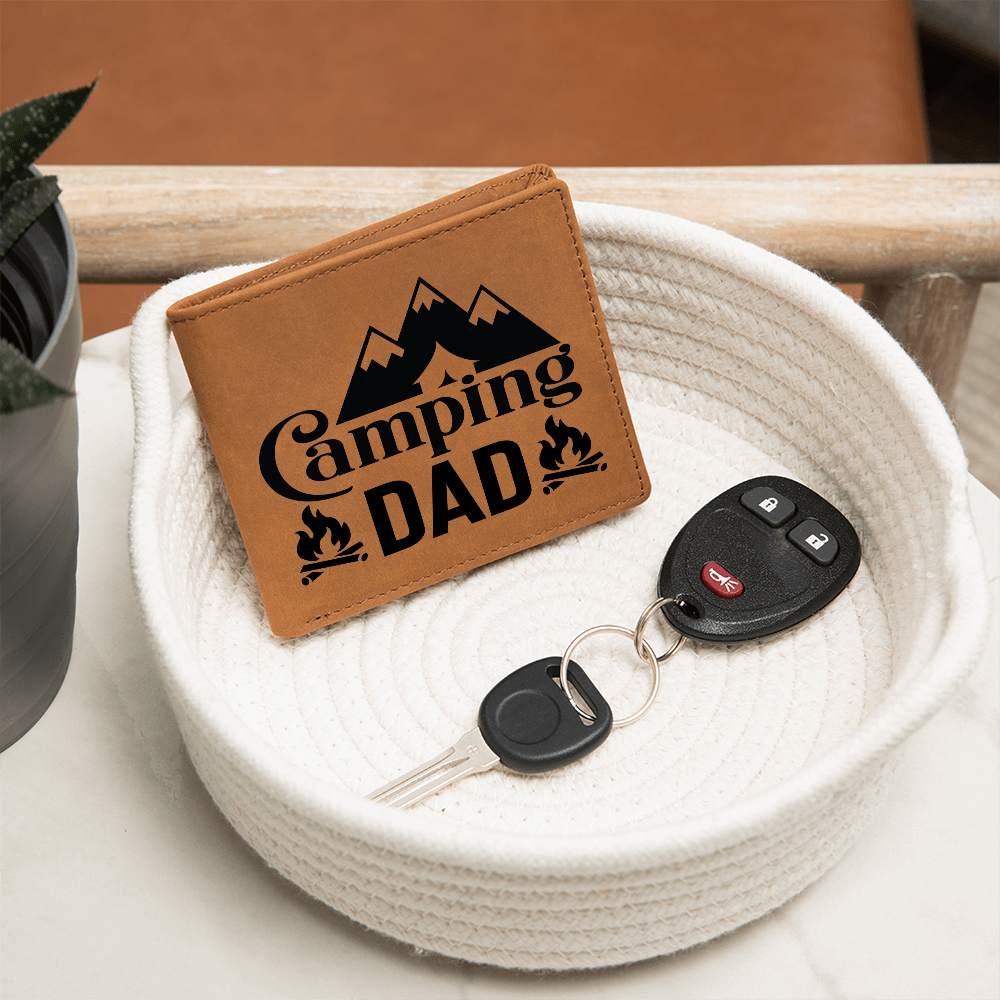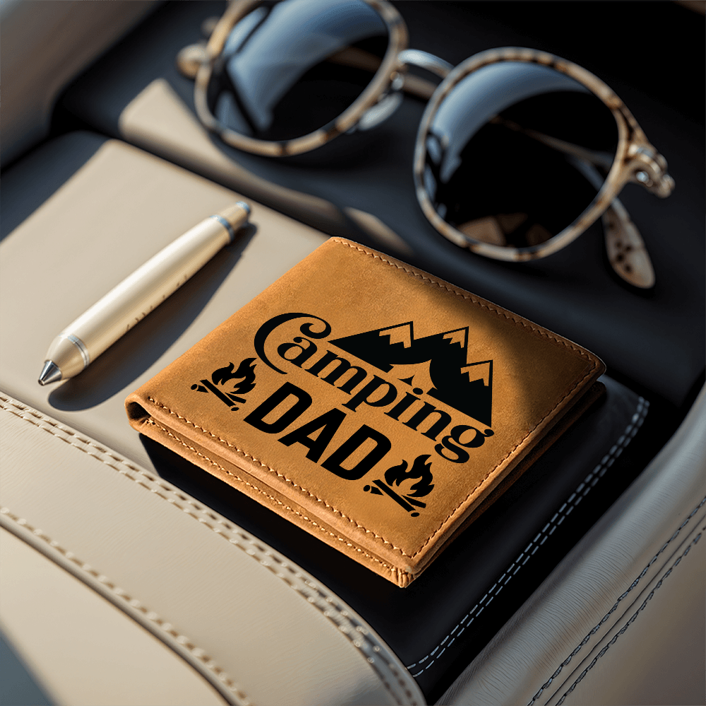 Surprise the camping enthusiast in your life with this unique leather wallet featuring the text "Camping Dad," surrounded by two charming campfires and below a mountain range with a clever tent cutout design. Crafted from high-quality leather, it combines rugged durability with a nod to his love for the great outdoors. Ideal for Father's Day, birthdays, or any occasion, this wallet is a heartfelt gift that reflects his adventurous spirit and passion for camping. Let him carry a piece of the wilderness with him wherever he goes!