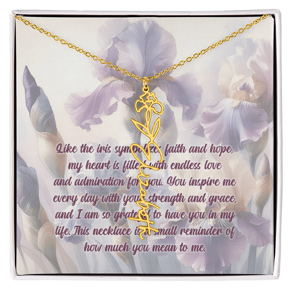 Celebrate her unique beauty with our custom script name necklace, elegantly adorned with her delicate birth month flower. This personalized treasure is a heartfelt gift designed to be cherished forever. Crafted in a flowing script font, it's a beautiful way to keep her special bloom close to her heart. Give the gift of timeless elegance and personal meaning.