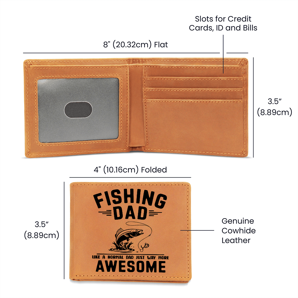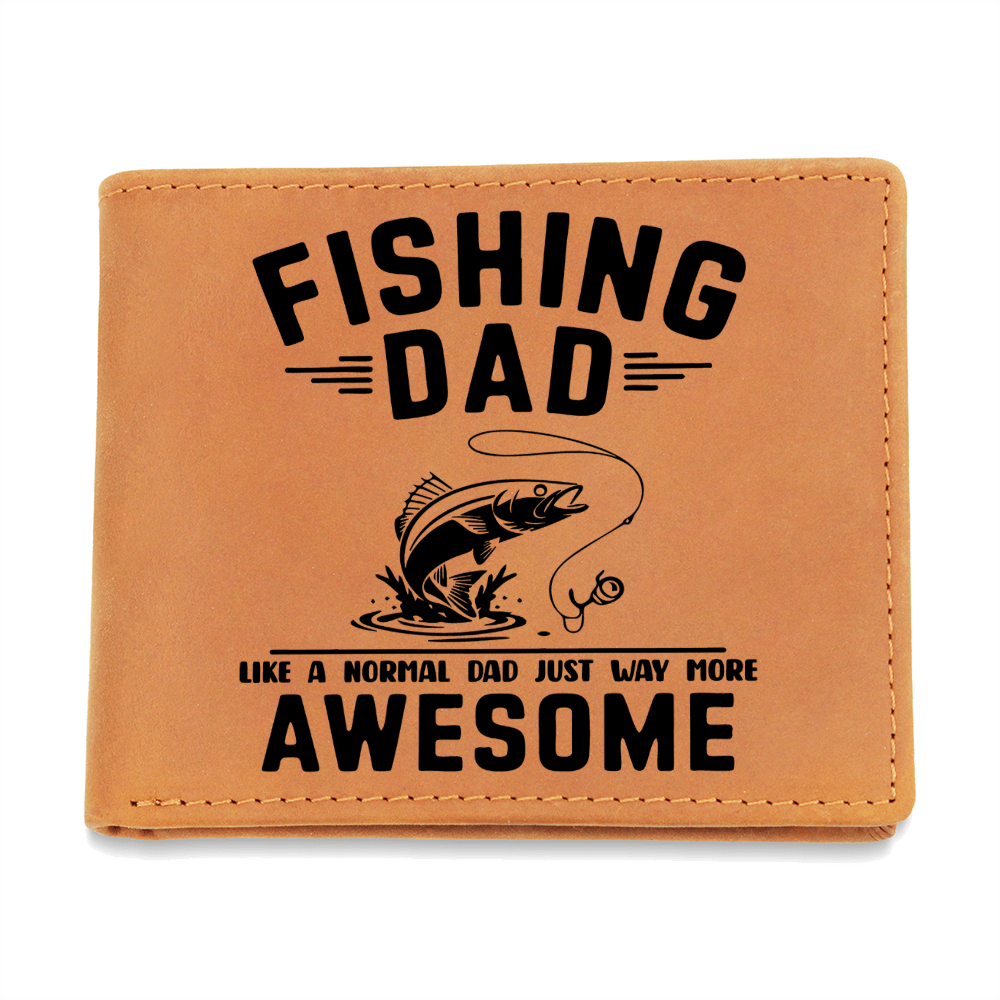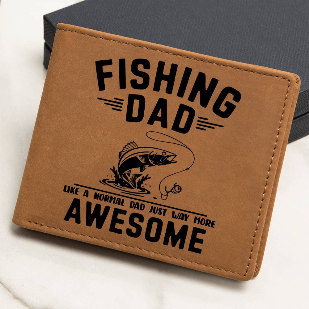 Surprise your fishing-loving dad, husband or significant other with this unique leather wallet, emblazoned with the playful phrase "Fishing Dad: Like a Normal Dad, But Way More Awesome." Made from high-quality leather, it’s both stylish and functional, perfect for everyday use. Ideal for Father's Day, a birthday, or just to show appreciation, this wallet is a great way to celebrate his awesome dad skills!