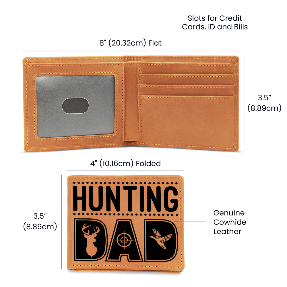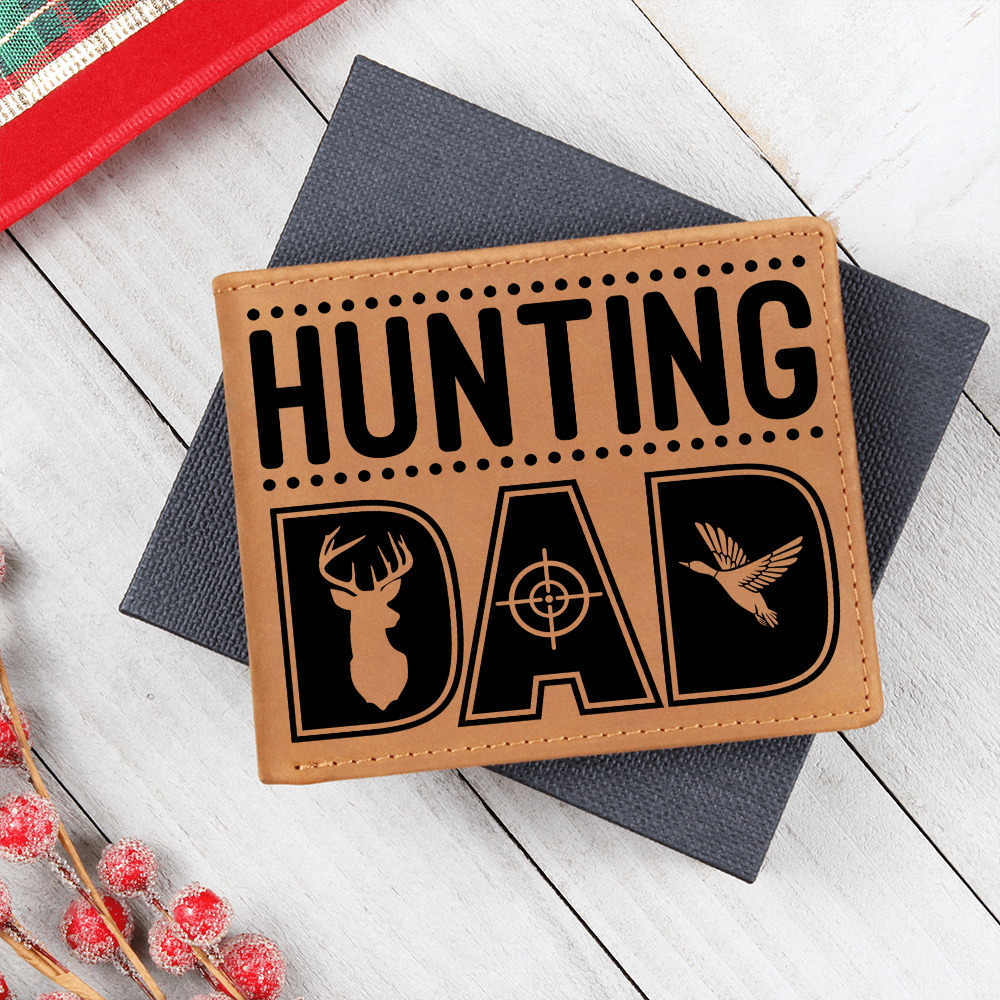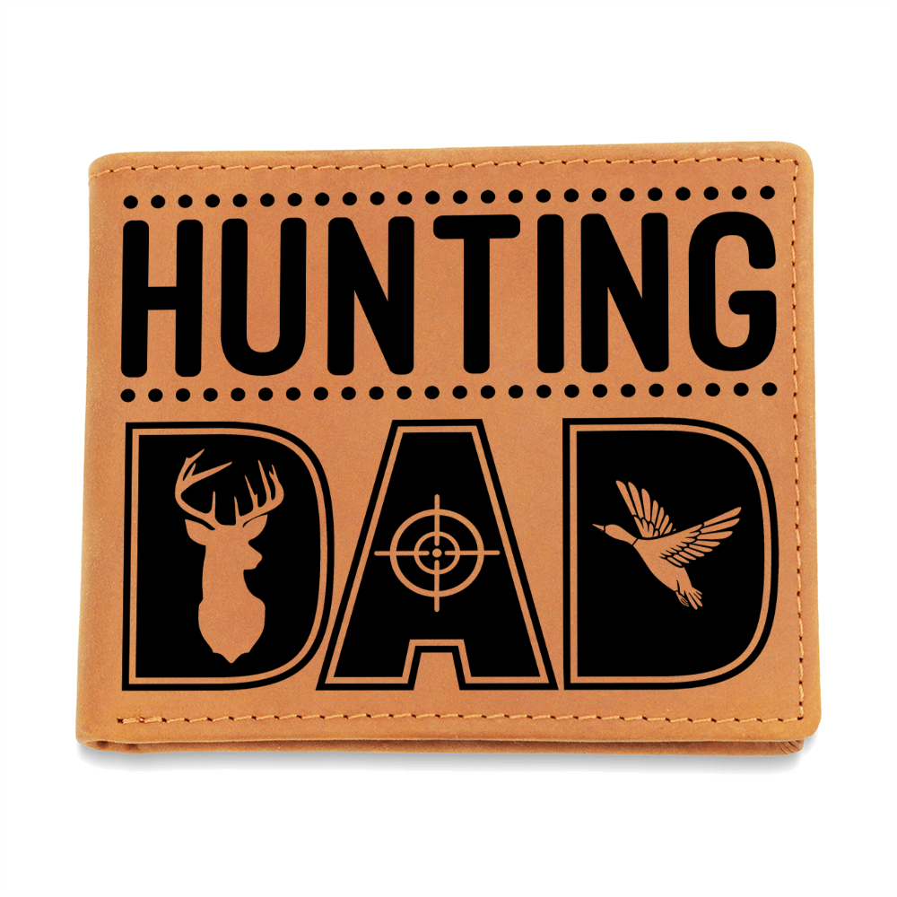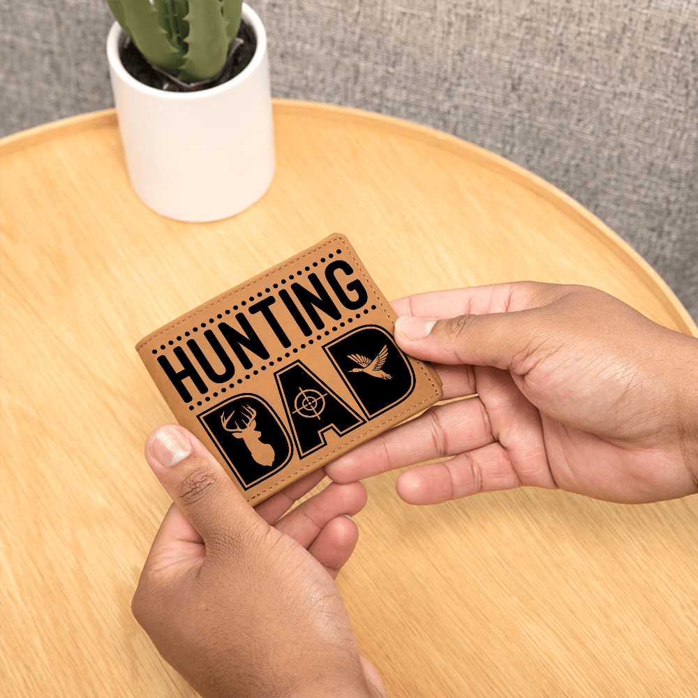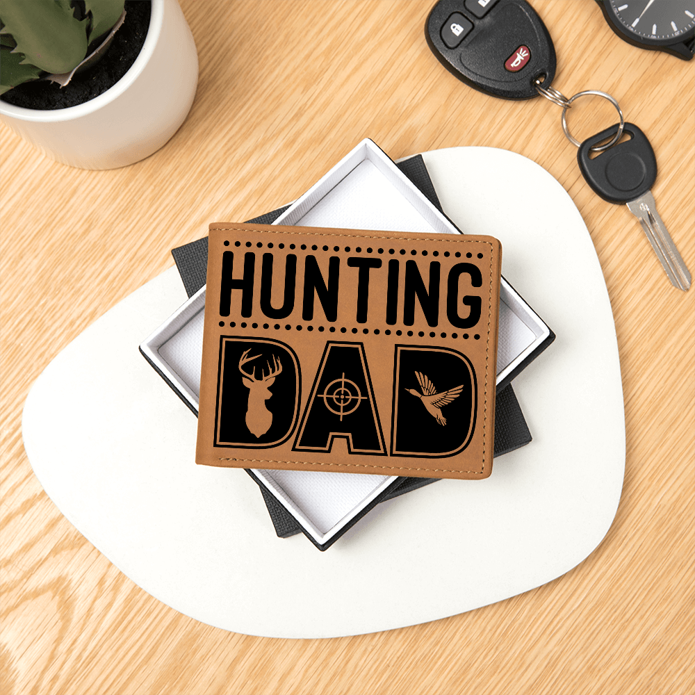 Honor your outdoorsy dad, husband or significant other with this eye-catching leather wallet featuring the word "Dad" adorned with iconic hunting images of a deer, target, and duck. Crafted from high-quality genuine full grain cowhide leather, it combines rugged style with practicality. Perfect as a gift for Father's Day, his birthday, or just because, it’s a tribute to his adventurous spirit and love for the hunt!