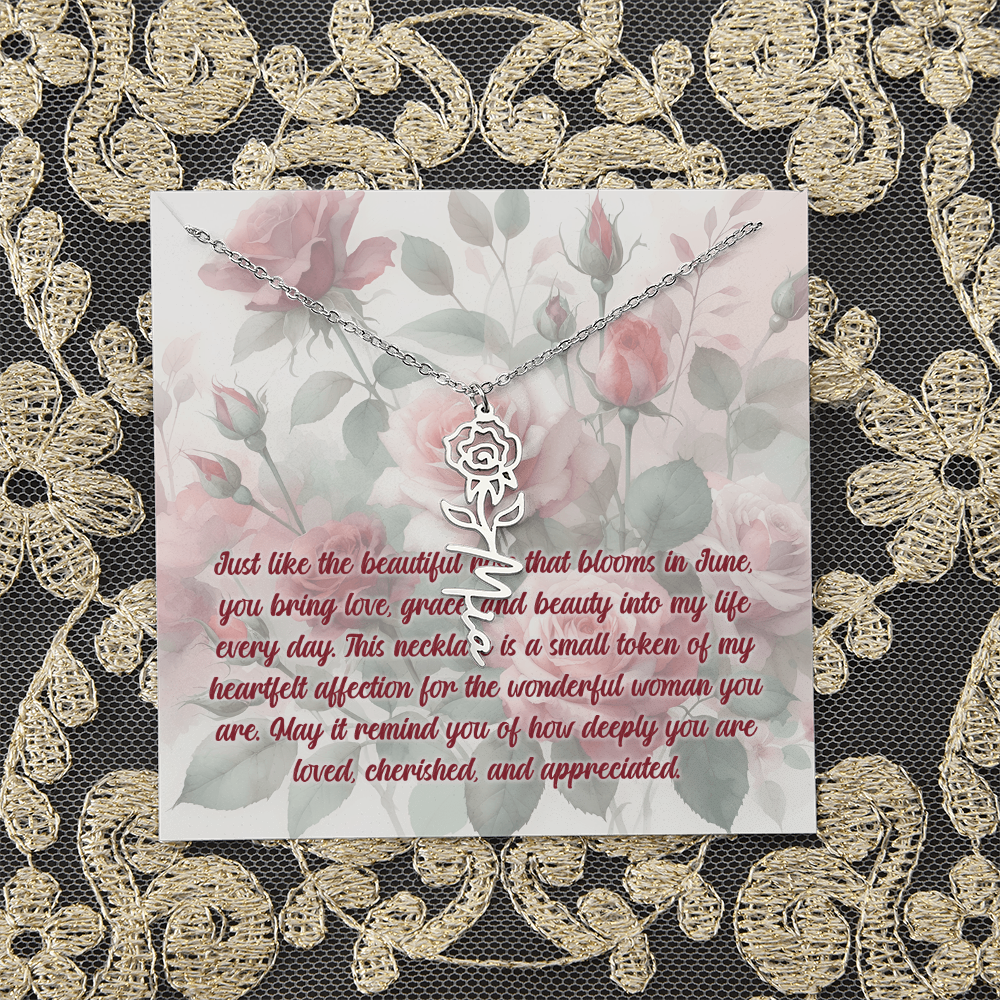 Celebrate her unique beauty with our custom script name necklace, elegantly adorned with her delicate birth month flower. This personalized treasure is a heartfelt gift designed to be cherished forever. Crafted in a flowing script font, it's a beautiful way to keep her special bloom close to her heart. Give the gift of timeless elegance and personal meaning.